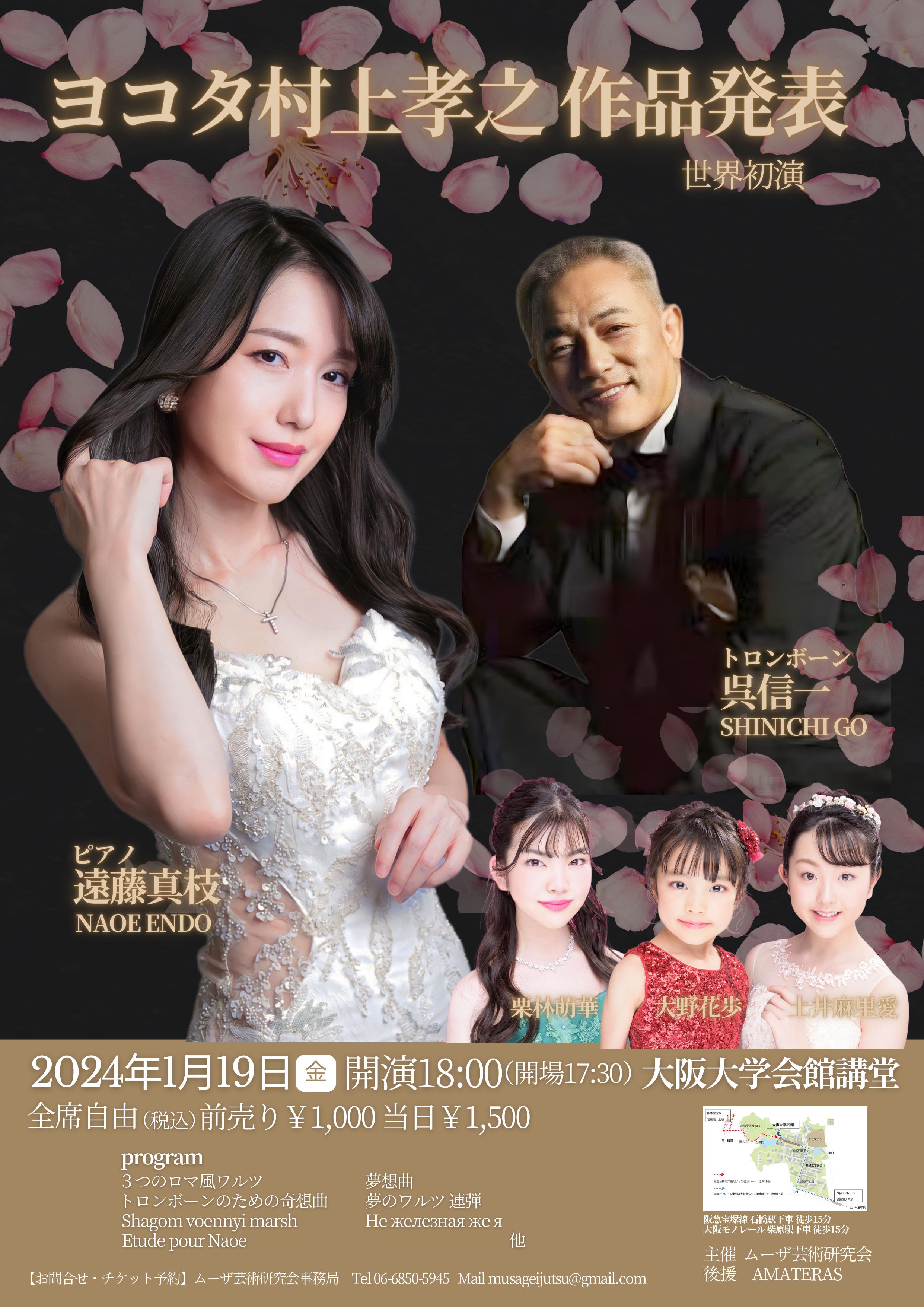 ぼくの書いたピアノ曲を、芦屋在住のピアニスト遠藤真枝さんが弾いてくれます。2024年1月19日(金)18時より、大阪大学会館講堂にて。元大阪フィルハーモニー首席トロンボーン奏者の呉信一さんも共演してくれます。クラシックのコンサートですが、聴いて楽しいライト・クラシックの曲ばかりですので、ぜひご来聴ください。詳しくは下のチラシをご覧くださいね。