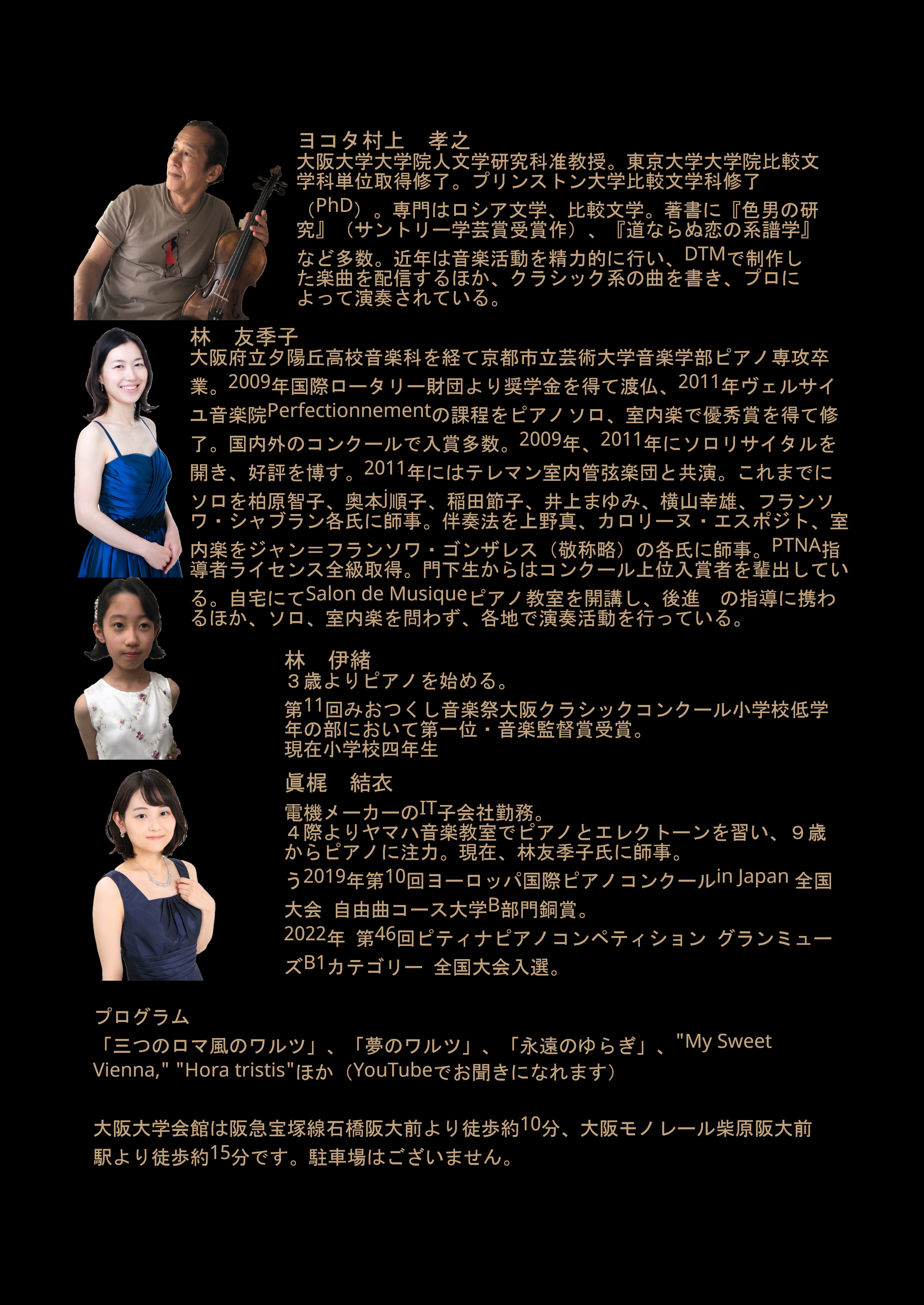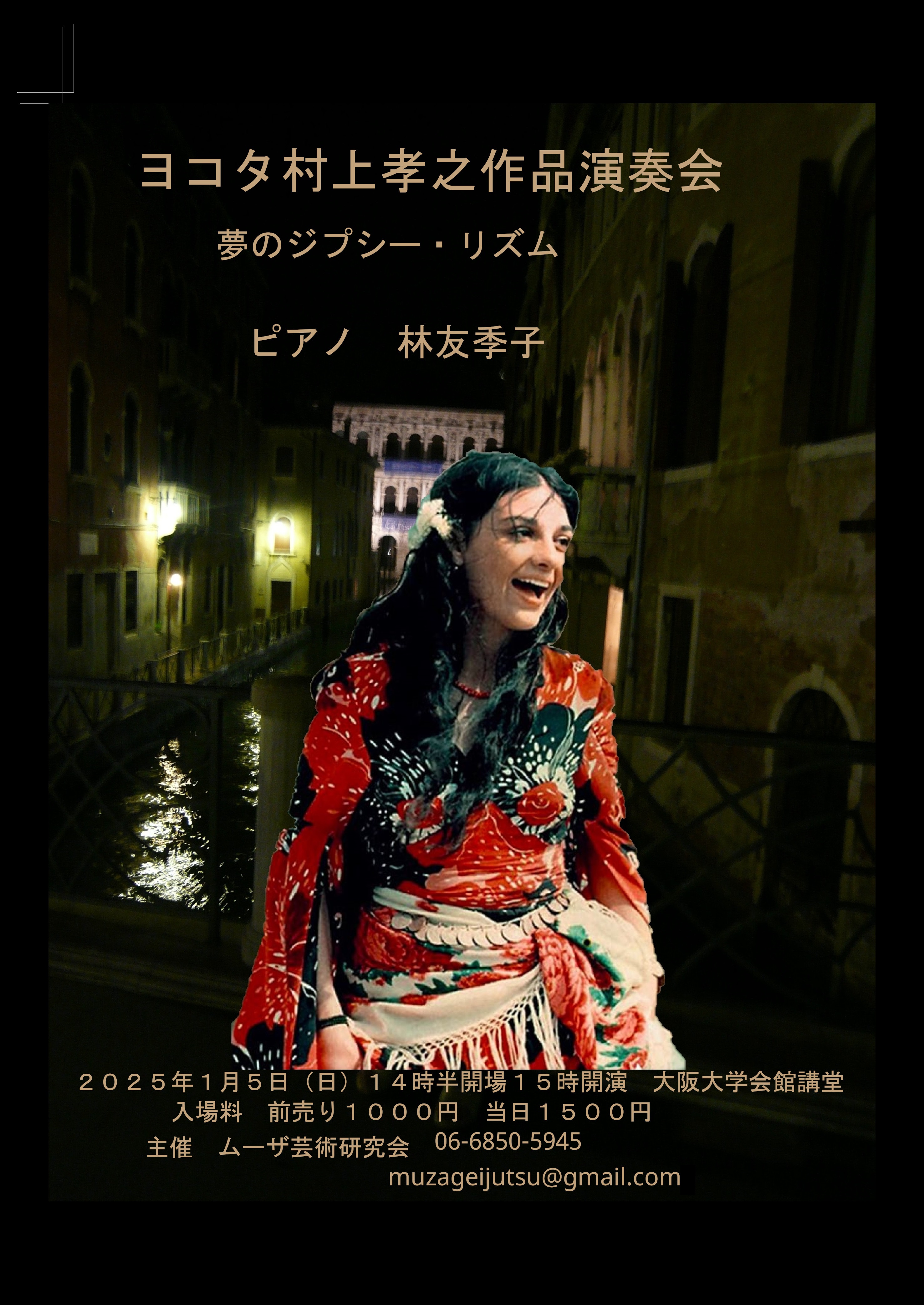 ぼくの曲のリサイタル、第二回目です。こんどはフランス仕込みの林友季子さんが弾いてくれます。また、今回はロマ(ジプシー)風の作品を中心にプログラムを組み、「夢のジプシー・リズム」とサブ・タイトルを付けました。ジプシー風の曲の美しくも愁いを含んだ旋律と、沸き立つリズムをお楽しみください。